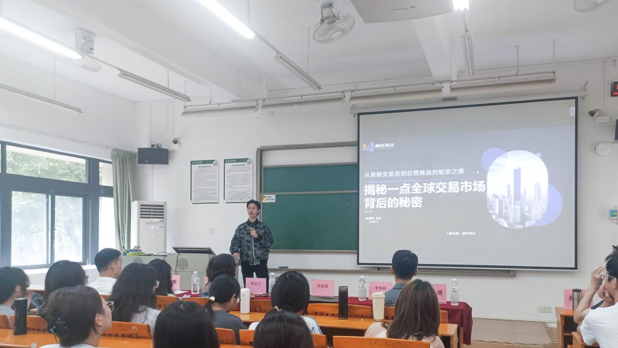 张家铭校友高中期间就开启了创业实践,靠金融创新项目斩获20多万首桶金,进入大学后,通过校园创业实践积累经验和人脉。毕业后投身金融业,普华永道、CICC中金公司、香港汇心公司等金融公司和机构中历练,积累了宝贵的行业经验和深厚的专业知识。2017年成立虎跃资本管理有限公司,历经股票投资亏损过半,合伙人背叛出走等挫折,在不断学习实践中找到属于自己的方向。他表示金融业机遇与风险并存,专注潜力领域5年或能成功,针对全球经济衰退,他认为危机中有机遇,建议关注全球经济动态,善用技术分析。同时鼓励大家加强学习,明确自身定位,做好职业规划。