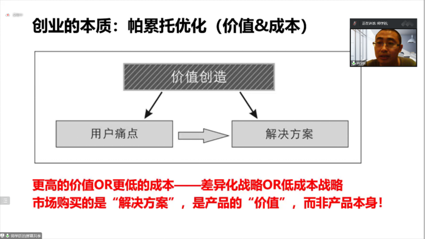 在“创业的本质”部分,师学廷老师通过帕累托优化的原理引出创业的定义和条件,并从创业的核心、创业的过程、创业业务层面的战略以及创业的方法等方面对创业的本质进行论述。
