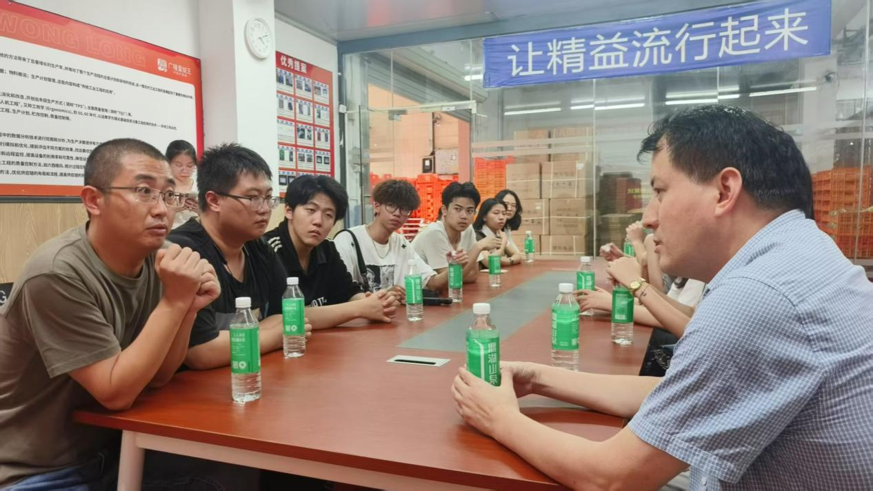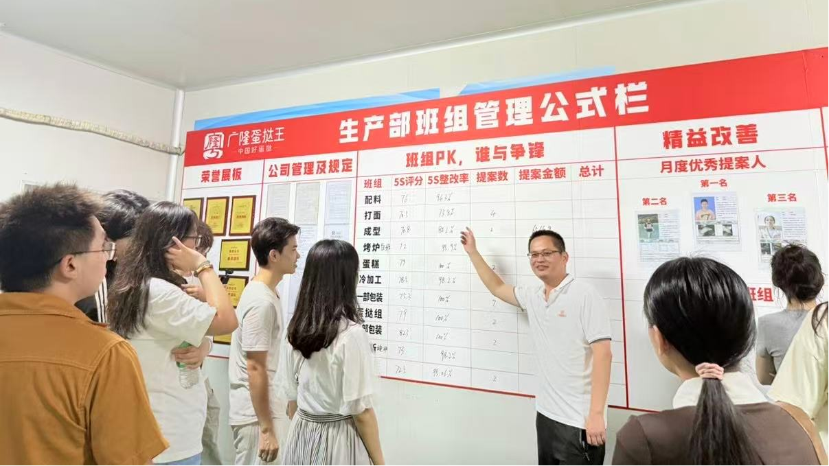 随后,参访团队来到广隆食品有限公司总部,参观了中央厨房与产品生产线。在生产区,由生产管理部高经理亲自讲解,带领大家从原料处理、酥皮制备、烘焙包装到仓储出库等环节逐一参观。他指出广隆蛋挞王已全面引入精益生产理念和KPI绩效体系,追求最小浪费、最大效率,“每月都有生产环节能优化”。高经理还补充说,每一道工序背后都嵌入了品控机制与培训规范,确保产品品质高度一致,这也是其能在全国范围复制门店的底气。参访过程中,师生们被高效运作的生产体系与细致入微的管理逻辑深深吸引。